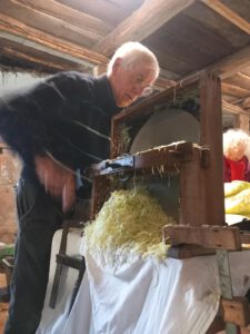 Auf der großen Diele begrüßt eine, durch sämtliche Generationen und Lebensentwürfe bunt gemischte „Crew“ vergnügt die noch ahnungslosen Neuankömmlinge, die etwas die Orientierung verlieren angesichts der verwirrend vielen Arbeitsplätze: Tische, Kübel, Holzstampfer, Waage, erschütternd große Holzkisten rappelvoll mit Spitzkohlköpfen und dem Zentrum des Geschehens: ein mit einer Kurbel betriebener altehrwürdiger Hobel, der das Kraut später in zartfeine Späne schreddern wird.